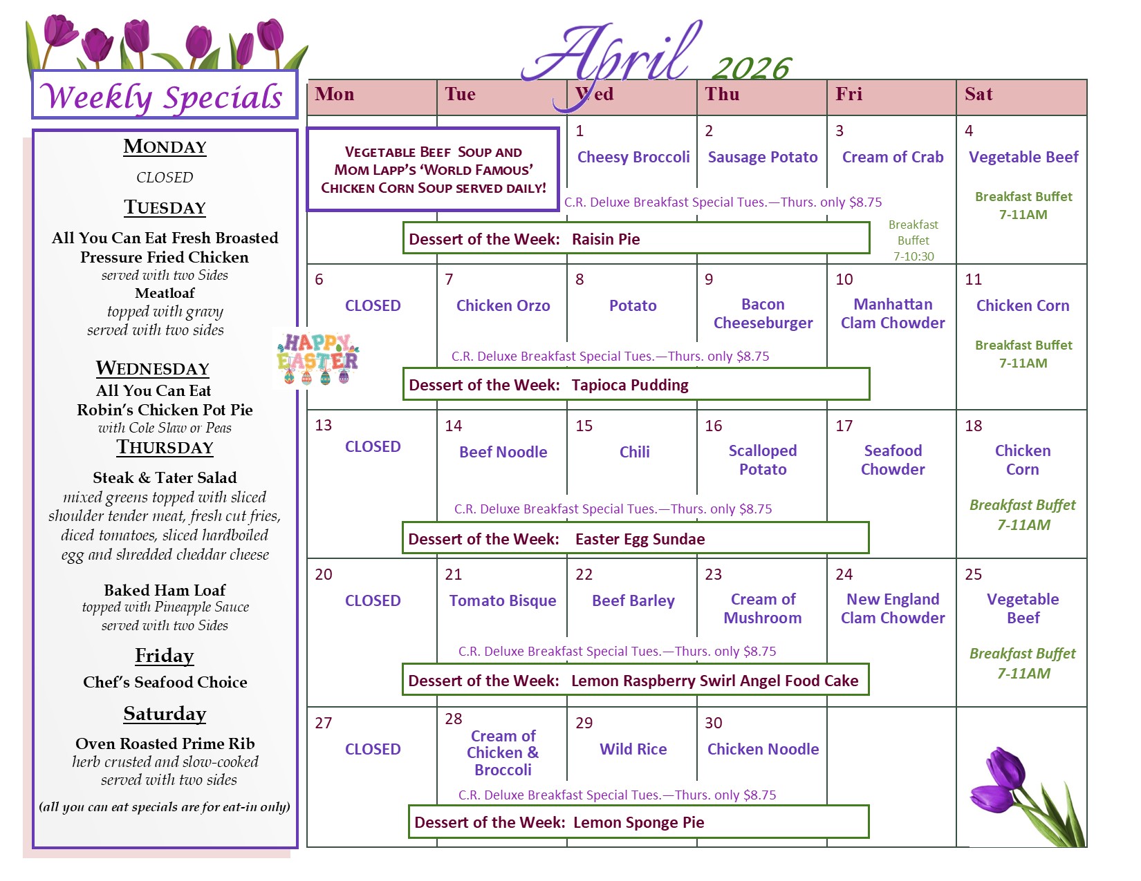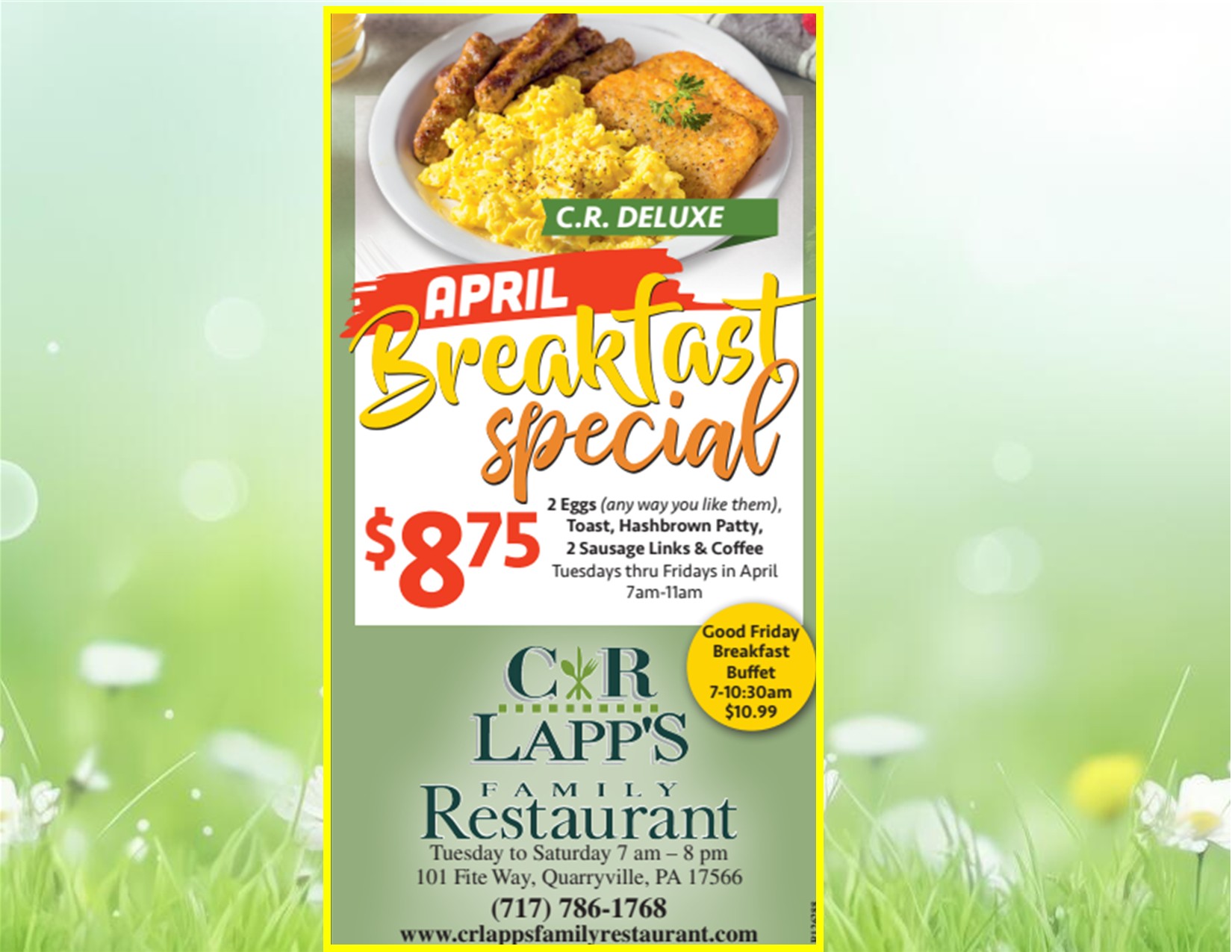 Christy and Robin Lapp opened C.R. Lapp’s Family Restaurant in the beautiful countryside of Quarryville, Pa. in February, 2005 with a desire to serve delicious and well prepared meals using the finest and freshest ingredients and traditional family recipes. We are dedicated to providing a clean family atmosphere and friendly service. It is in fond memory of Mom Lapp who taught Robin how to make chicken pot pie at age 6, brother Wilmer who took me under his wing, Robin’s parents Marianne and Bob Montgomery where our families first met and came together, that we opened our doors to C.R. Lapp’s Family Restaurant. Without our loved ones’ unconditional love, patience and guidance, this would still be a dream. After many years of combined experience we have taken what we have learned, and with our love for the business, decided to share it with our friends and neighbors. We take great pride in what we do and hope that you enjoy each and every visit. If you are not 100 percent satisfied, we would hope that you would share it with us before others so we can continue to exceed your expectations and keep you coming back for more. When you are hungry for a hearty meal that is sure to make you feel satisfied, take a drive down Rt. 372, (half mile west of 222) Quarryville to 101 Fite Way. Along with our family and employees, you are our greatest asset! -Christy and Robin Lapp